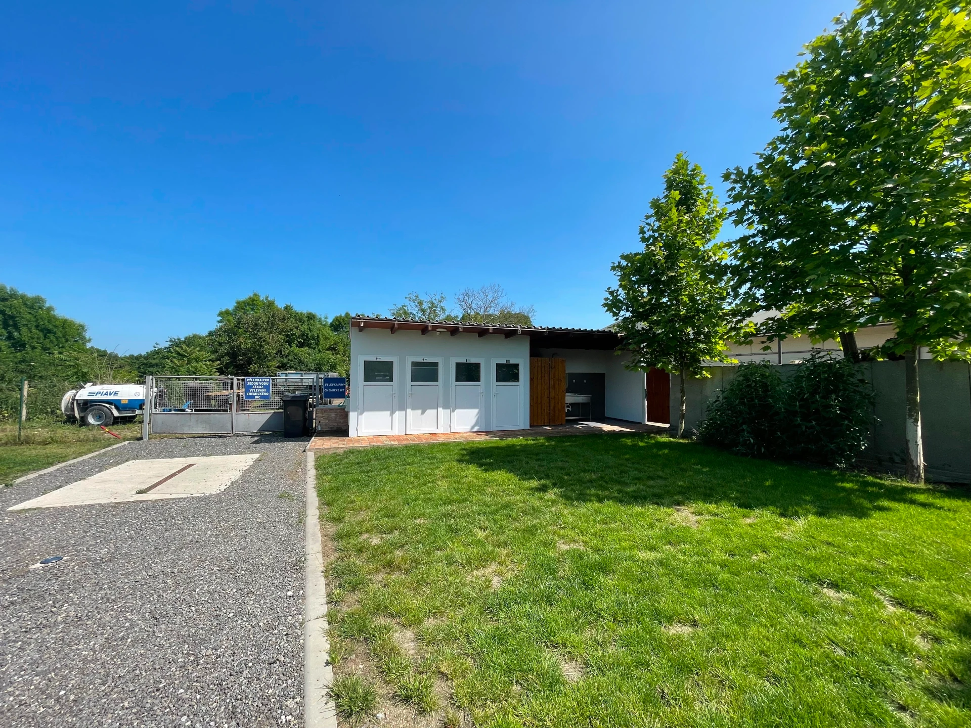 Nabízíme stání převážně na travnaté ploše, s elektrickou přípojkou, pitnou i užitkovou vodou, výlevkami na šedou i chemickou vodu, sprchami, toaletami, venkovní kuchyňkou a ohništěm – vše v ceně parkovného.